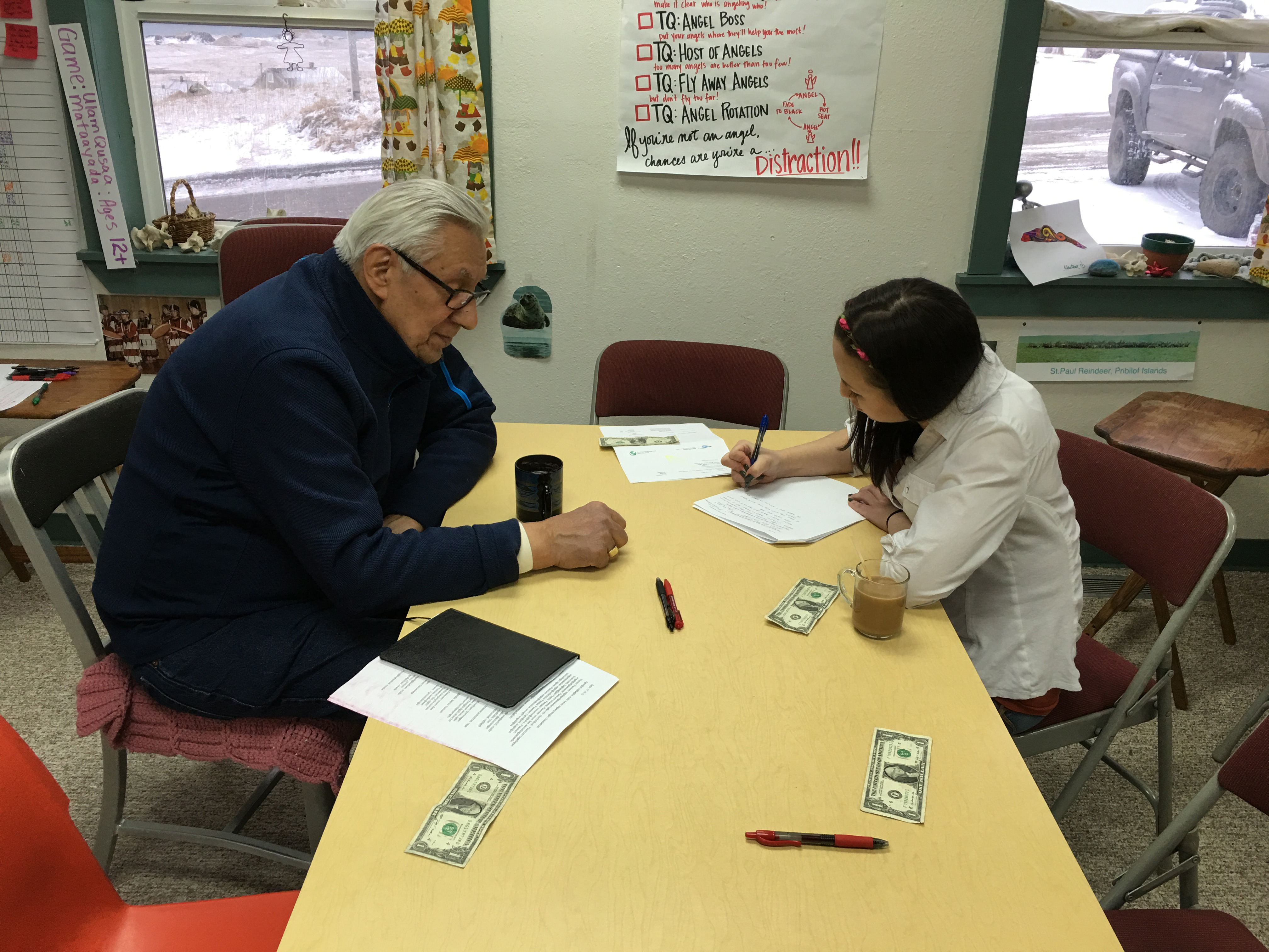 We were excited to work with many of the same team who were present for the 2015 summer intensive, including speakers Gregory Fratis, Edna Floyd, and Iliodor Philemonof. However, our winter visit looked very different from the summer intensive. In the summer, the St. Paul learners (mostly youth between the ages of 14–18), were able to work on the project all day, everyday (5 days a week). During the school year, we were only able to meet with the youth during their school day for an hour, after school for 2–3 hours, and for a few hours on the weekends. While the St. Paul community supports language work by including it as a part of the school day, and while the team continues to work on language outside of school, many of the learners commented that it was hard to maintain their gains in fluency from the summer because they had less time to devote to language each day. The balance between life, school, and language is something we see teen learners working on almost everywhere the WAYK team travels, and the St. Paul language team is doing a great job of making it a priority to sustain their efforts throughout the school year, as they look forward to another large project this summer.
