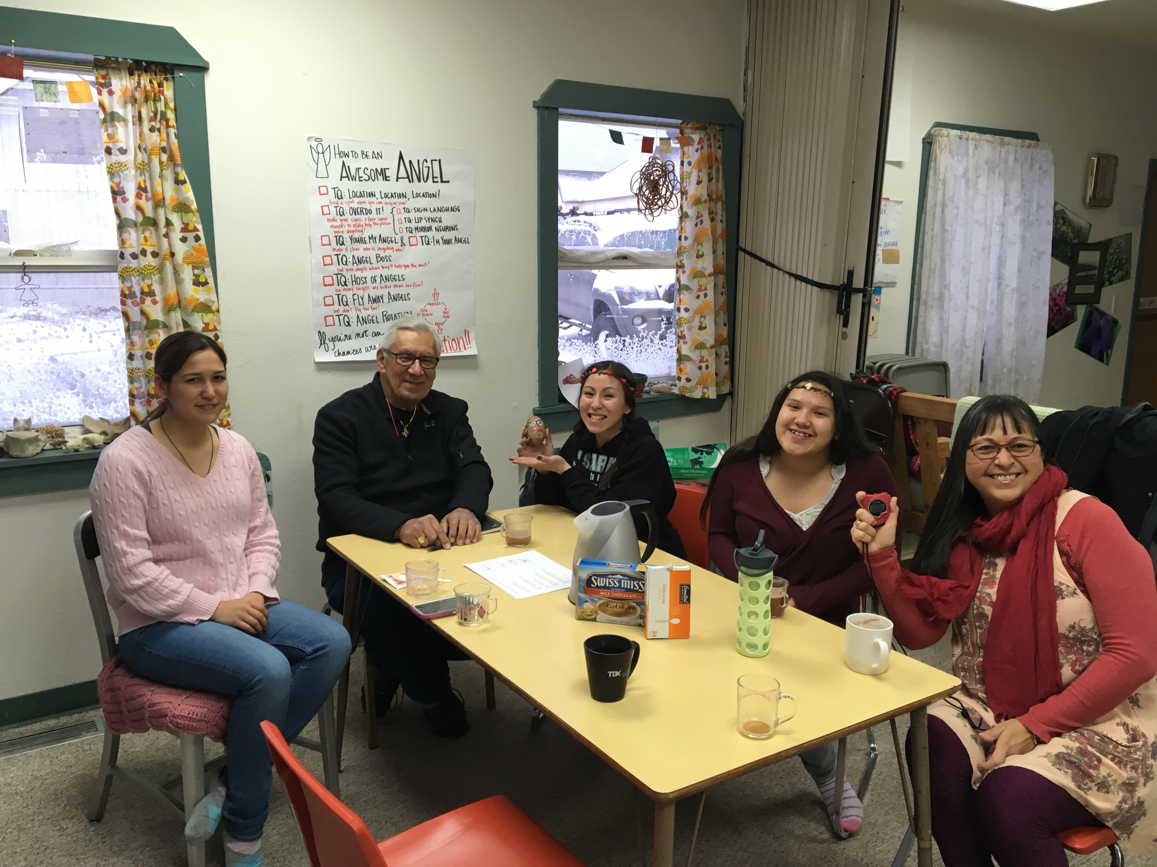 Perhaps the most valuable time we spent with the fluent speakers in St. Paul during this visit was practicing our Same Conversations. While you can develop a Same Conversation about almost anything, we have a couple of extremely reliable ones in our language toolbox including a game of Go Fish (with cards designed specifically for each language that we work with) and a “Coffee Talk,” i.e. making a hot beverage (coffee, tea, or cocoa). While we started playing Go Fish with the speakers during the Summer Intensive, we did not get a chance to develop a Coffee Talk. During this visit, we developed a basic cocoa-making conversation, that the youth practiced until they felt confident with the basic steps. Once these basic conversations are established they can become a great platform for launching into a hunt for new language.